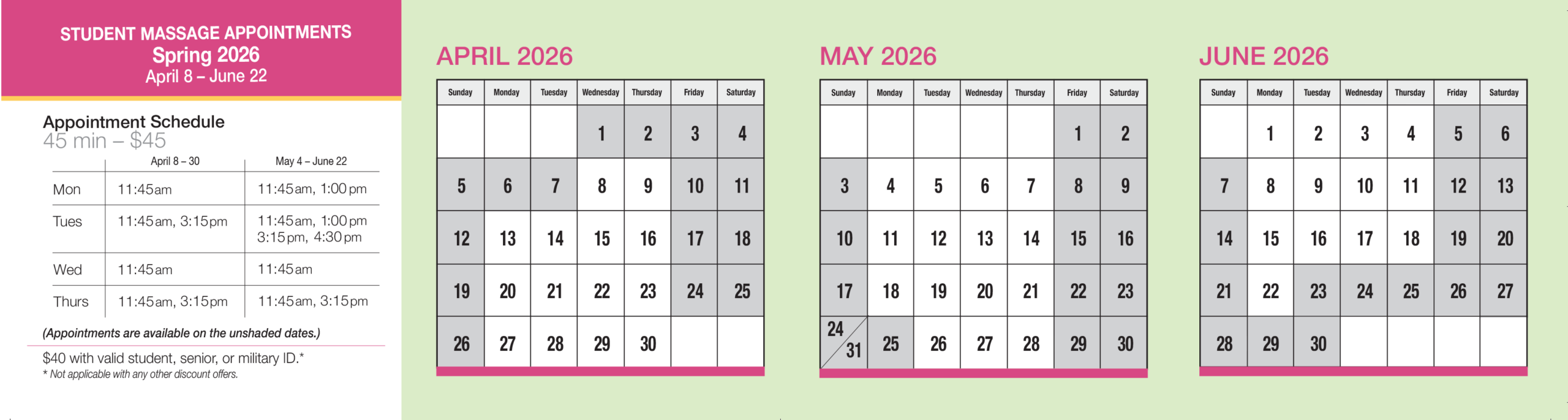Student Massage Treatment – it is important to ensure ample time necessary for the exit interview. Therefore you will be asked to pay for your appointment prior to receiving your massage.